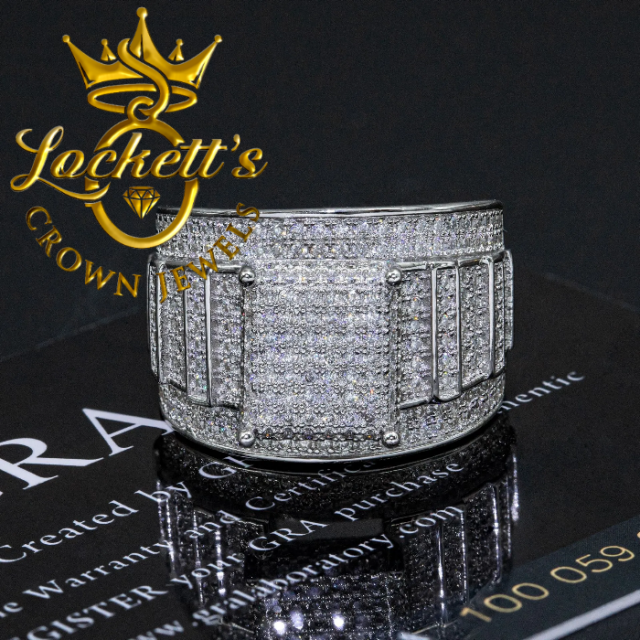 The ring features an iced-out design that is sure to turn heads. Adorned with meticulously set VVS1 Moissanite stones, each one radiates brilliance and fire, often surpassing traditional diamonds in sparkle. The ring’s bold design makes it a perfect statement piece for any occasion, whether you're hitting the club or attending a special event.