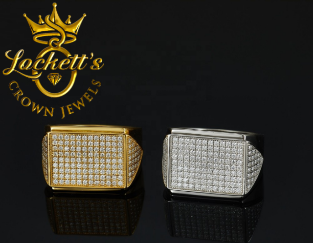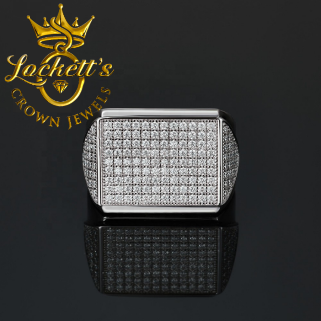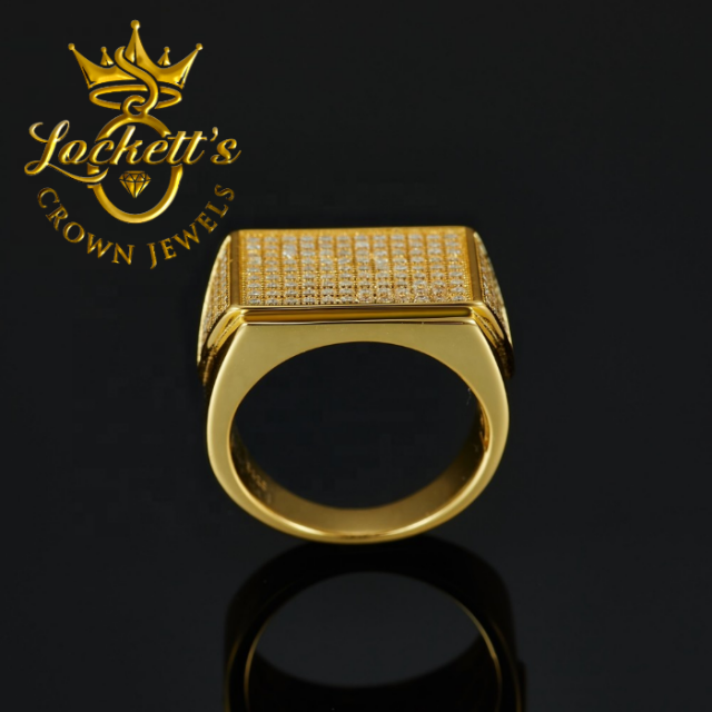 The ring features an iced-out design that showcases an array of brilliant VVS1 Moissanite stones. Each stone is expertly set to maximize its sparkle, creating a dazzling effect that rivals traditional diamonds. The bold, iced-out style makes this ring a standout piece that is sure to draw attention and compliments.